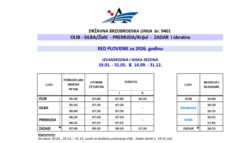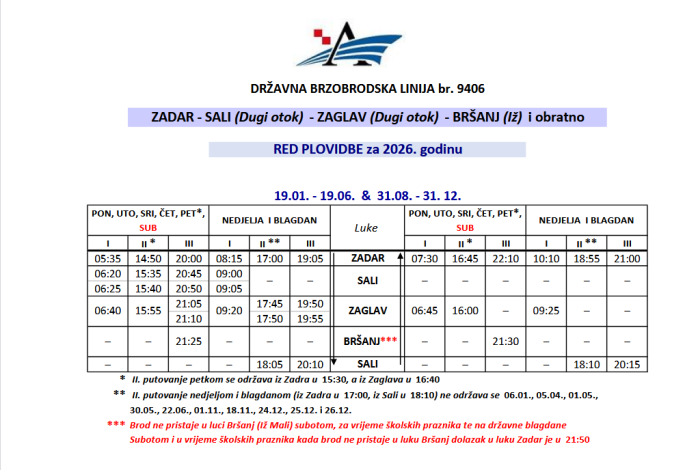 Obavještavamo putnike da se od 19. siječnja 2026. godine primjenjuje izmijenjeni red plovidbe na državnoj brzobrodskoj liniji br. 9406 Zadar – Sali – Zaglav – Bršanj i obratno.